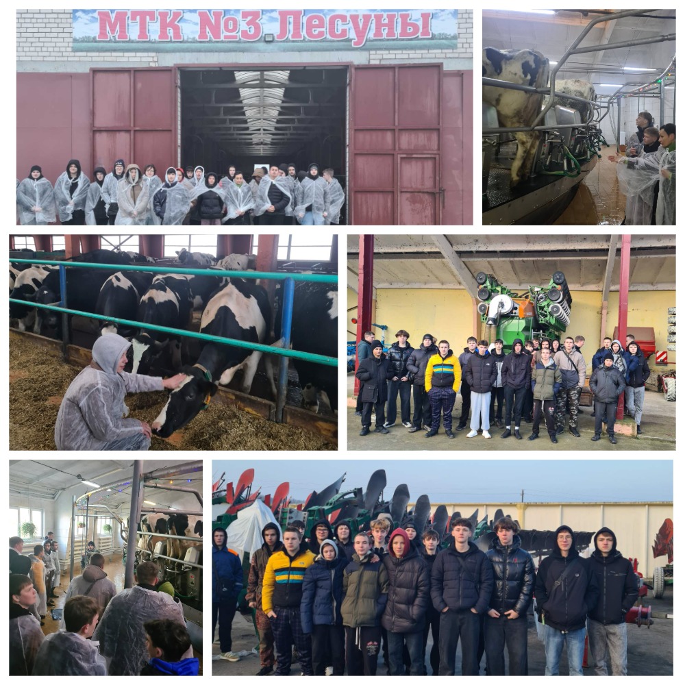 18 декабря учащиеся учебных групп 24.Т1, 24.Т.2 посетили ОАО "Козловичи-Агро": молочно-товарный комплекс в д.Лесуны (ознакомились с условиями содержания коров и телят; какие машины и оборудование применяют на комплексе для поддержания микроклимата, удаления навоза, хранения молока).При посещении машинно-тракторного парка ребята увидели, какая техника используется в хозяйстве для обработки почвы, для посева и уборки с/х культур, для химической защиты растений. Также увидели, какие условия созданы для работников в ремонтной мастерской.
