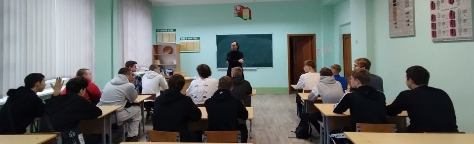 Денис Терёхин - руководитель братства Святой Софии Слуцкой, помощник благочинного по работе с молодежью Слуцкой епархии рассказывает первокурсникам о значимости жизни, жизненных ценностях, традициях христиан.