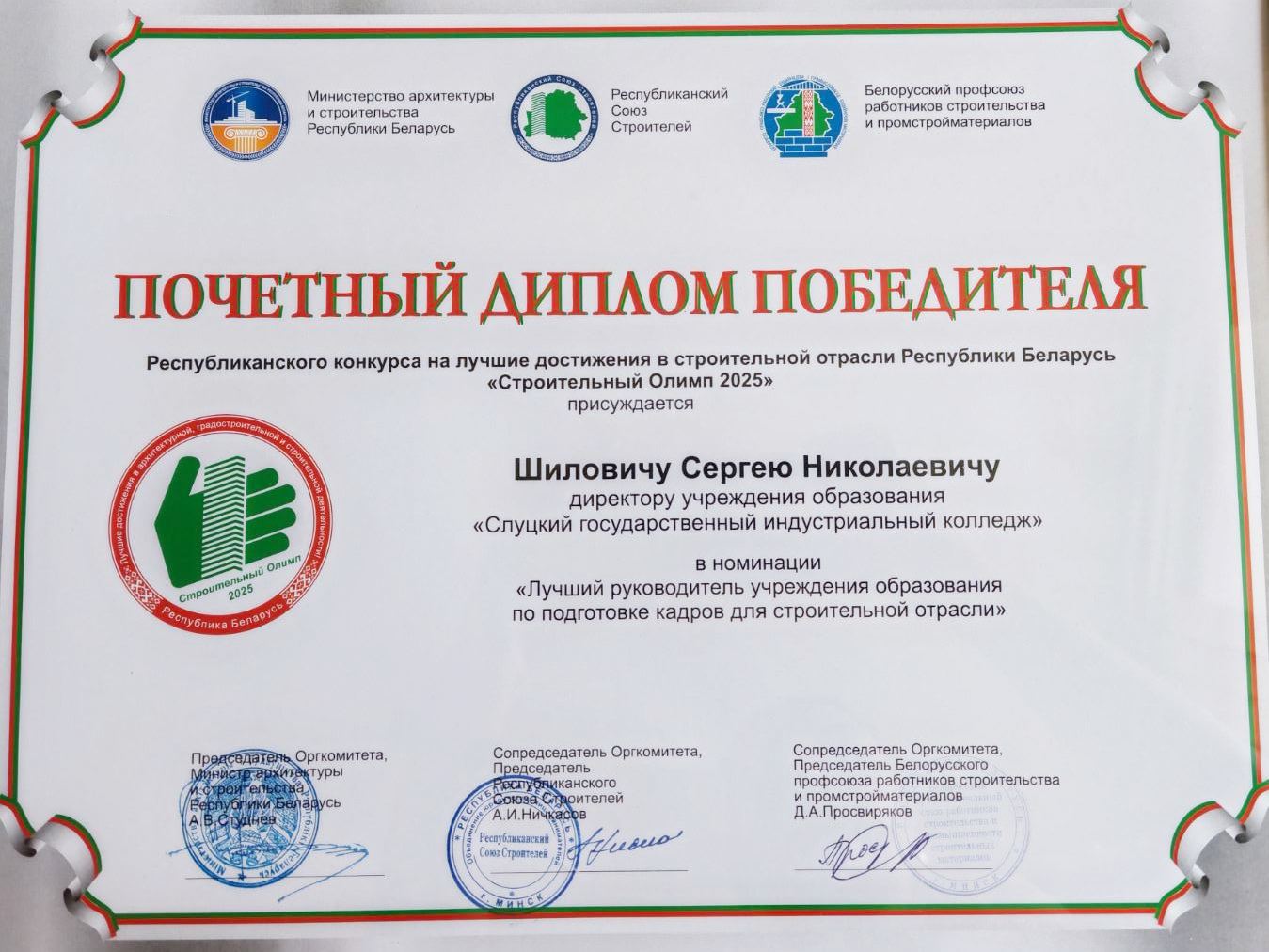 по итогам ежегодного республиканского конкурса на лучшие достижения в строительной отрасли Республики Беларусь "Строительный Олимп-2025" директор колледжа Шилович Сергей Николаевич удостоен ПОЧЕТНОГО ДИПЛОМА ПОБЕДИТЕЛЯ в номинации "Лучший руководитель учреждения образования по подготовке кадров в строительной отрасли", учреждение образования "Слуцкий государственный индустриальный колледж" отмечено дипломом лауреата в номинации "Лучшее учреждение образования по подготовке кадров для строительной отрасли".
