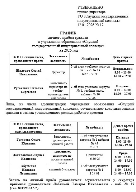График приема граждан » Слуцкий государственный индустриальный колледж